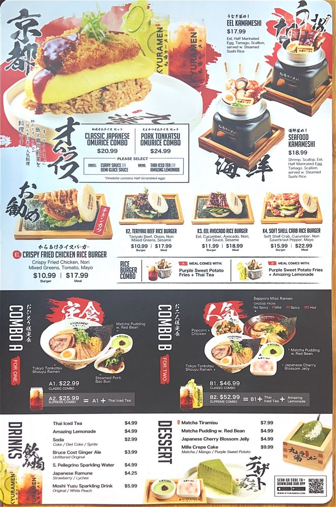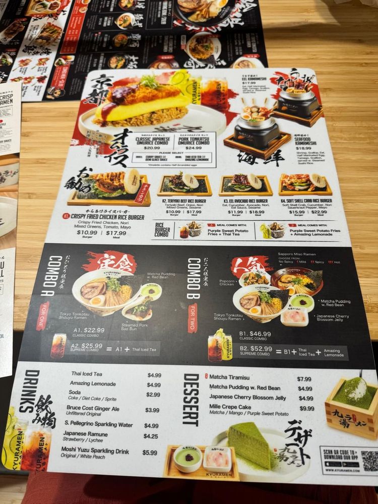 Combo includes:kyushu tonkotsu shio ramen (Choose Garlic Oil Flavor)Sapporo miso ramen (Choose Spicy Level)popcorn chickenJapanese cherry blossom jellymatcha pudding w. red beanThai Iced TeaAmazing Lemonade