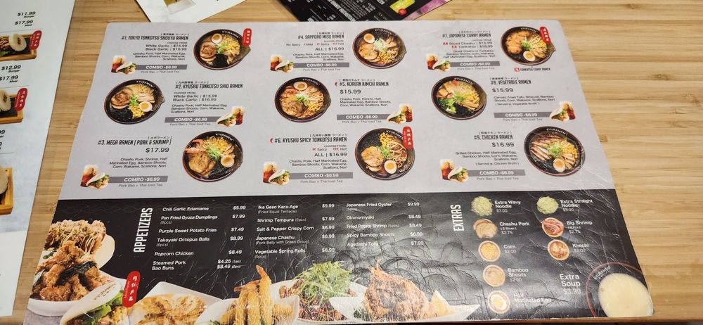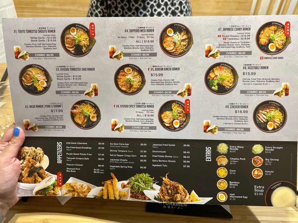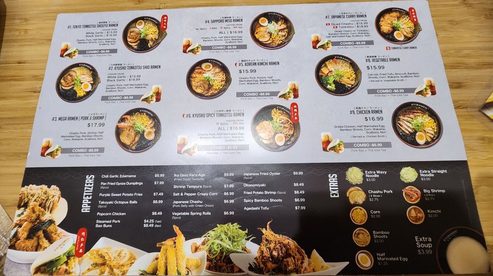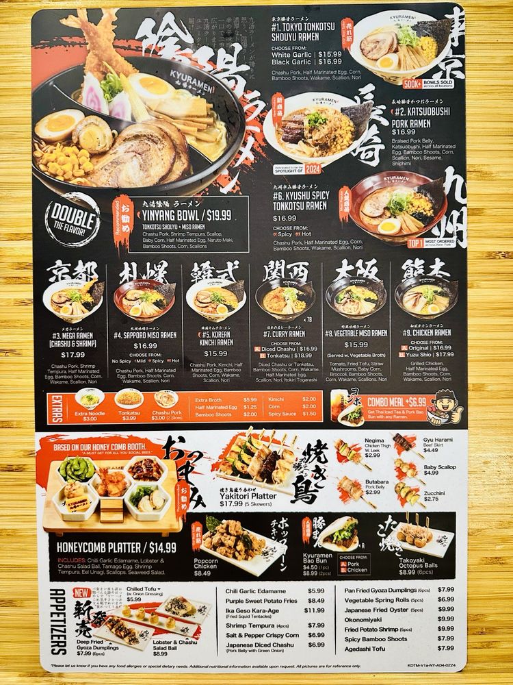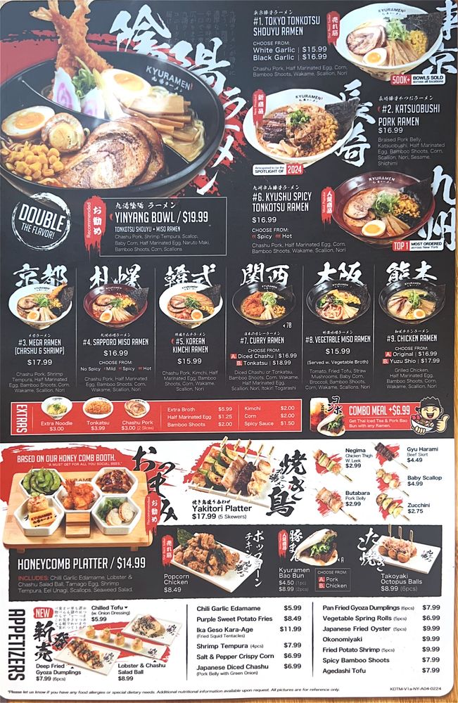 Kyuramen - Garden City offers a variety of ramen dishes with options such as Tokyo Tonkotsu Shouyu Ramen and Katsuobushi Pork Ramen. The menu also includes appetizers like Agedashi Tofu and Fried Potato Shrimp. Customers praise the delicious food, friendly staff, and cozy atmosphere. The restaurant provides a unique dining experience with private booths and a mix of Japanese and Chinese dishes. The fruity beer and lunch specials receive positive feedback. Overall, Kyuramen - Garden City stands out for its authentic Japanese flavors, efficient service, and creative menu offerings.